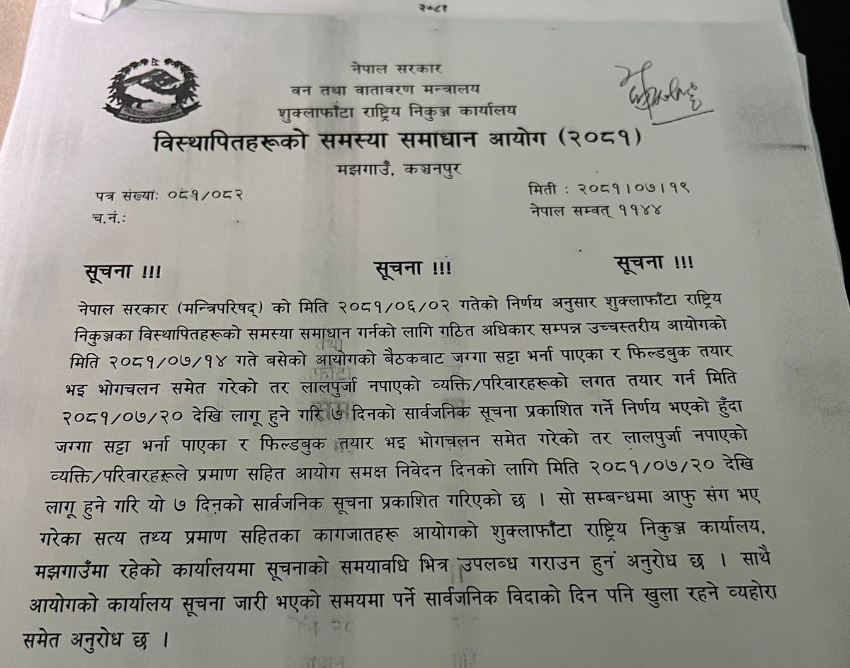 शुक्लाफाँटा राष्टिय निकुञ्ज विस्थापितहरुको समस्यासमाधान आयोग कञ्चनपुरको सुचना