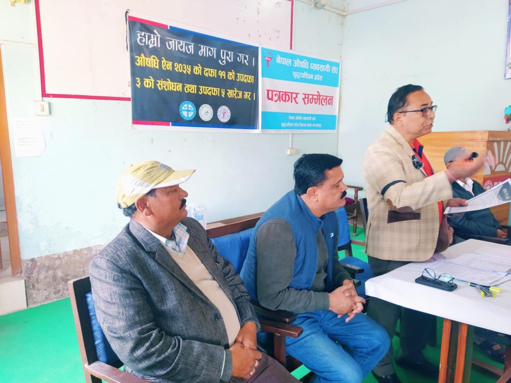 आन्दोलनकै विच सोमबार महेन्द्रनगरका नेपाल औषधी व्यवसायी संघ सुदूरपश्चिम प्रदेश समितिले पत्रकार सम्मेलन गर्दै औषधी ऐन ०३५को दफा ११को उपदफा ३को संशोधन तथा उपदफा ५ खारेजीको माग अघि सारेका छन । सरकारले औषधी व्यवसायीमाथि अन्याय गरेको भन्दै दैनिक १देखि २ घण्टा औषधी पसल बन्द गरेर आन्दोलनमा उत्रेका छन ।