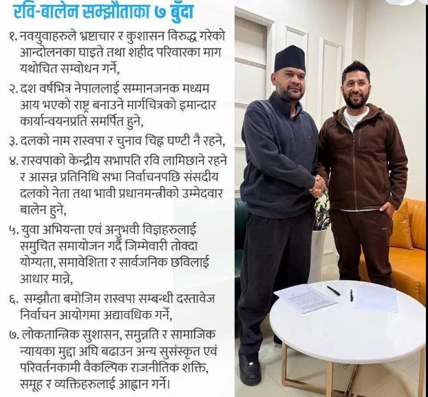 सार्थक डेस्क।नेपाली राजनीतिमा ‘नयाँ’ शब्द सधैं आशाको पर्याय बनाइन्छ। पुराना दलले दशकौंसम्म भागबन्डाको नाममा राज्य दोहन गरे भन्ने जनआक्रोशकै बीच रवि लामिछाने र बालेन शाहको राजनीतिक मिलनलाई पनि त्यही आशाको खोल ओढाइँदै छ। तर सार्वजनिक गरिएको सातबुँदे समझदारी पढ्दा प्रश्न उठ्छ ,यो दस्तावेज परिवर्तनको खाका हो कि दलाल संरचनाको पुनःप्याकेजिङ ?